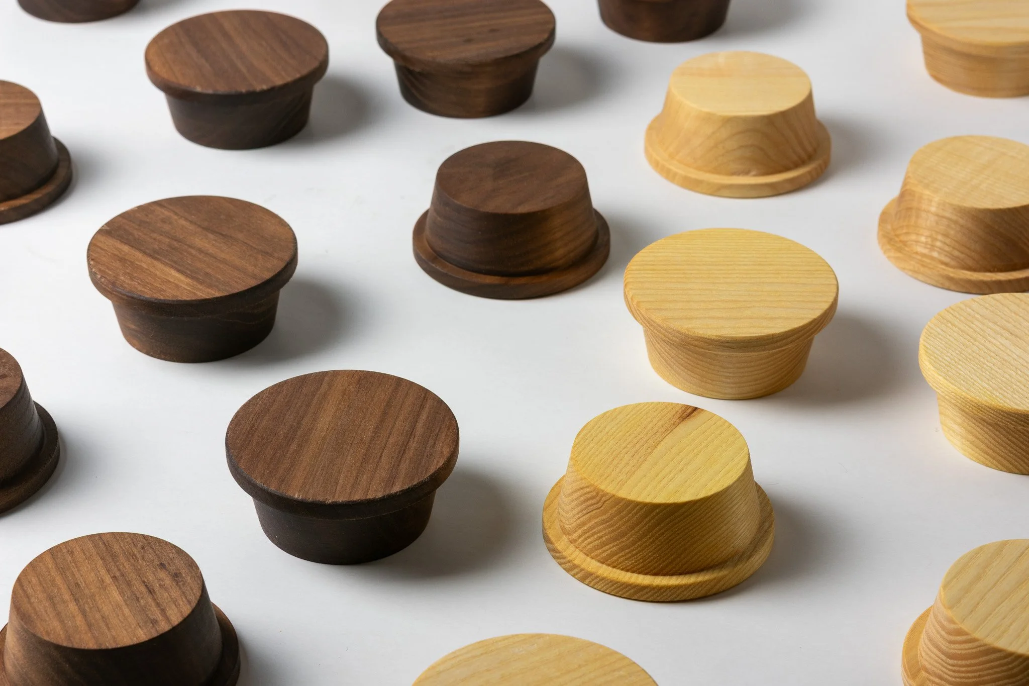 Each object is cast in porcelain and fitted with a wooden lid made from walnut or ash. Donut is reduction-fired, a technique chosen in coherence with the porcelain body and for the subtle depth of color it gives to glazes.