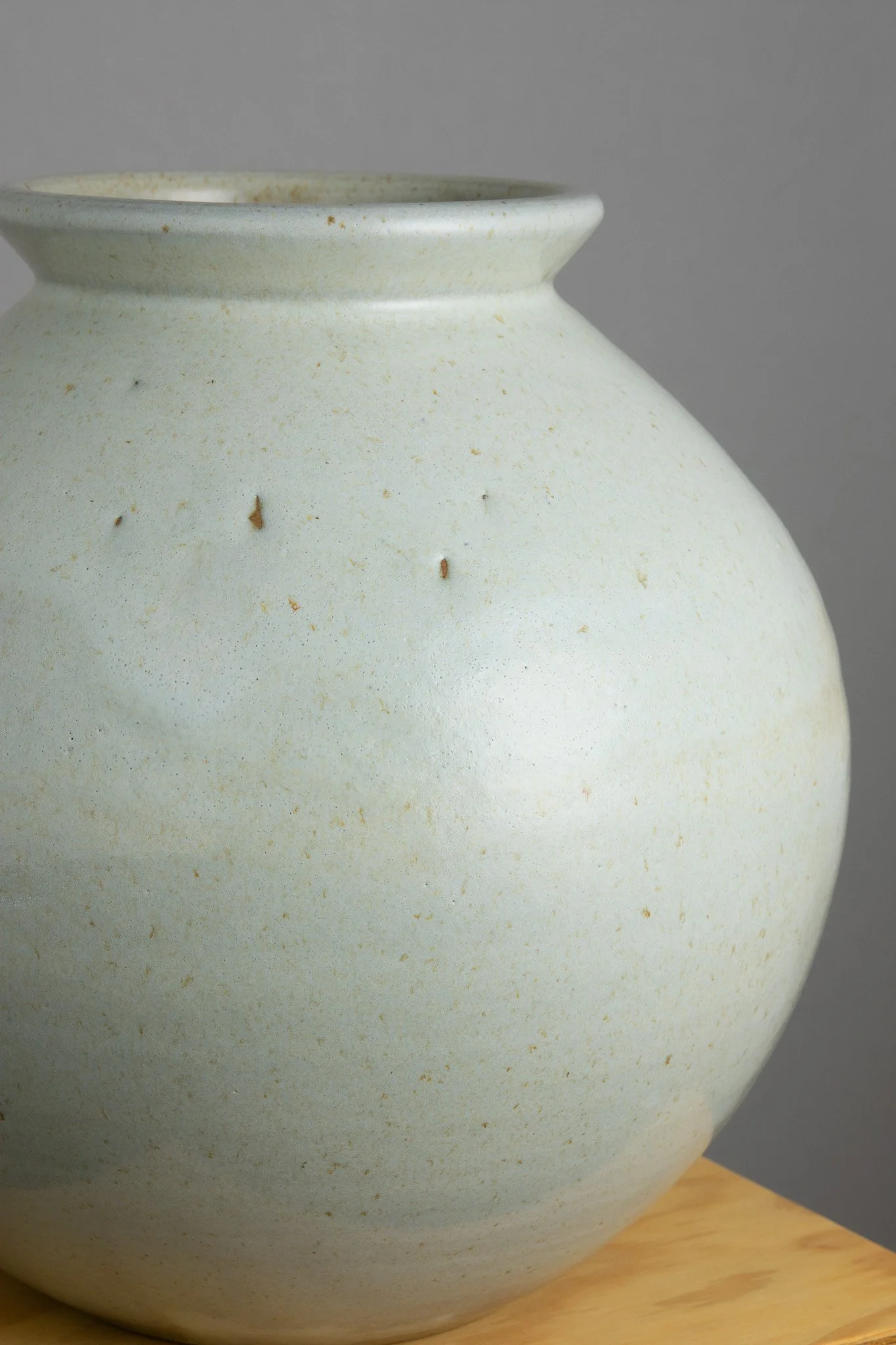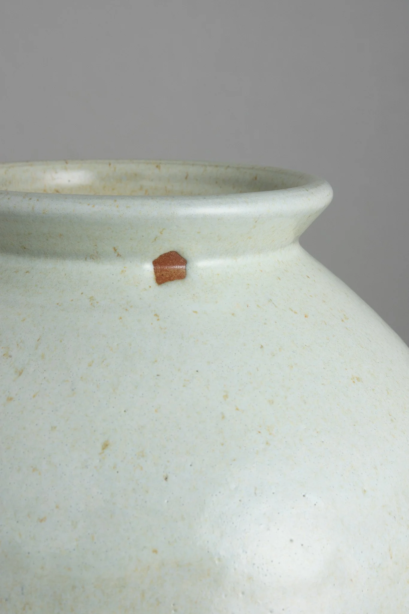 The thick, silky matte glaze displays subtle, characteristic crawling, revealing glimpses of the warm, toasty clay beneath. Heavy and generously rounded, the jar has a strong, bulky presence while still radiating a quiet softness. It can be used for flower arrangements or appreciated purely as a sculptural object.
